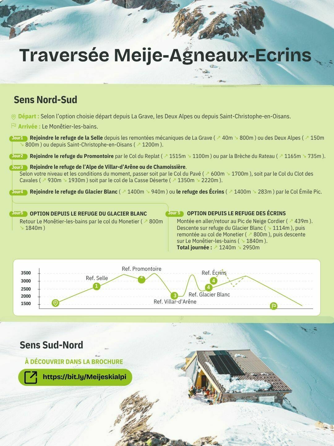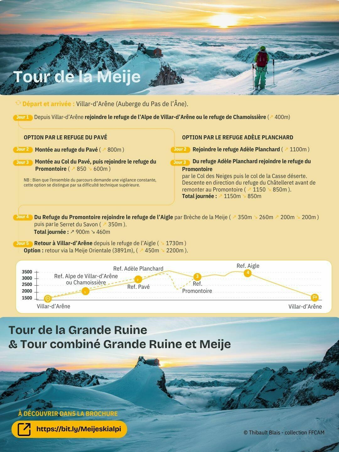 La FFCAM et ses partenaires ont identifiés les principaux itinéraires autour de la Meije, à retrouver sur une brochure téléchargeable sur ce lien : https://bit.ly/Meijeskialpi.